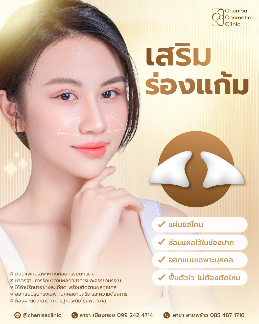 เสริมร่องแก้ม เสริมร่องแก้มเหมาะกับใคร? ผู้ที่มีร่องแก้มลึกและต้องการให้ร่องแก้มตื้นขึ้นผู้ที่ไม่ต้องการการดูแลรักษาหรือการเติมเต็มซ้ำๆ เช่น การฉีดฟิลเลอร์ผู้ที่มีปัญหาผิวหนังหย่อนคล้อยบริเวณร่องแก้มและต้องการการปรับโครงสร้างที่ชัดเจนผู้ที่ต้องการปรับปรุงรูปหน้าให้ดูสมส่วนมากขึ้นผู้ที่ต้องการวิธีการที่มีผลลัพธ์อยู่ได้นาน