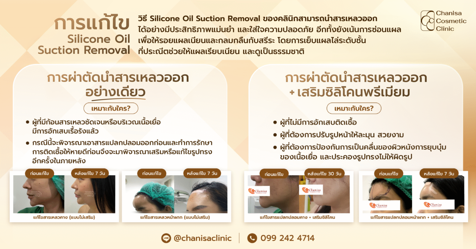 • การผ่าตัดก้อนซิลิโคนเหลวออกอย่างเดียว แพทย์จะแนะนำทำในรายที่มีก้อนชัดเจน หรือบริเวณเนื้อเยื่อที่มีการอักเสบเรื้อรังแล้ว Silicone Oil Suction Removal (SOSR) ของคลินิกสามารถนำสารเหลวออกได้อย่างมีประสิทธิภาพ แม่นยำ และใส่ใจความปลอดภัย อีกทั้งยังเน้นการซ่อนแผล เพื่อให้รอยแผลเนียนและกลมกลืนกับสรีระ โดยการเย็บแผลที่ประณีตช่วยให้แผลเรียบเนียนและดูเป็นธรรมชาติ