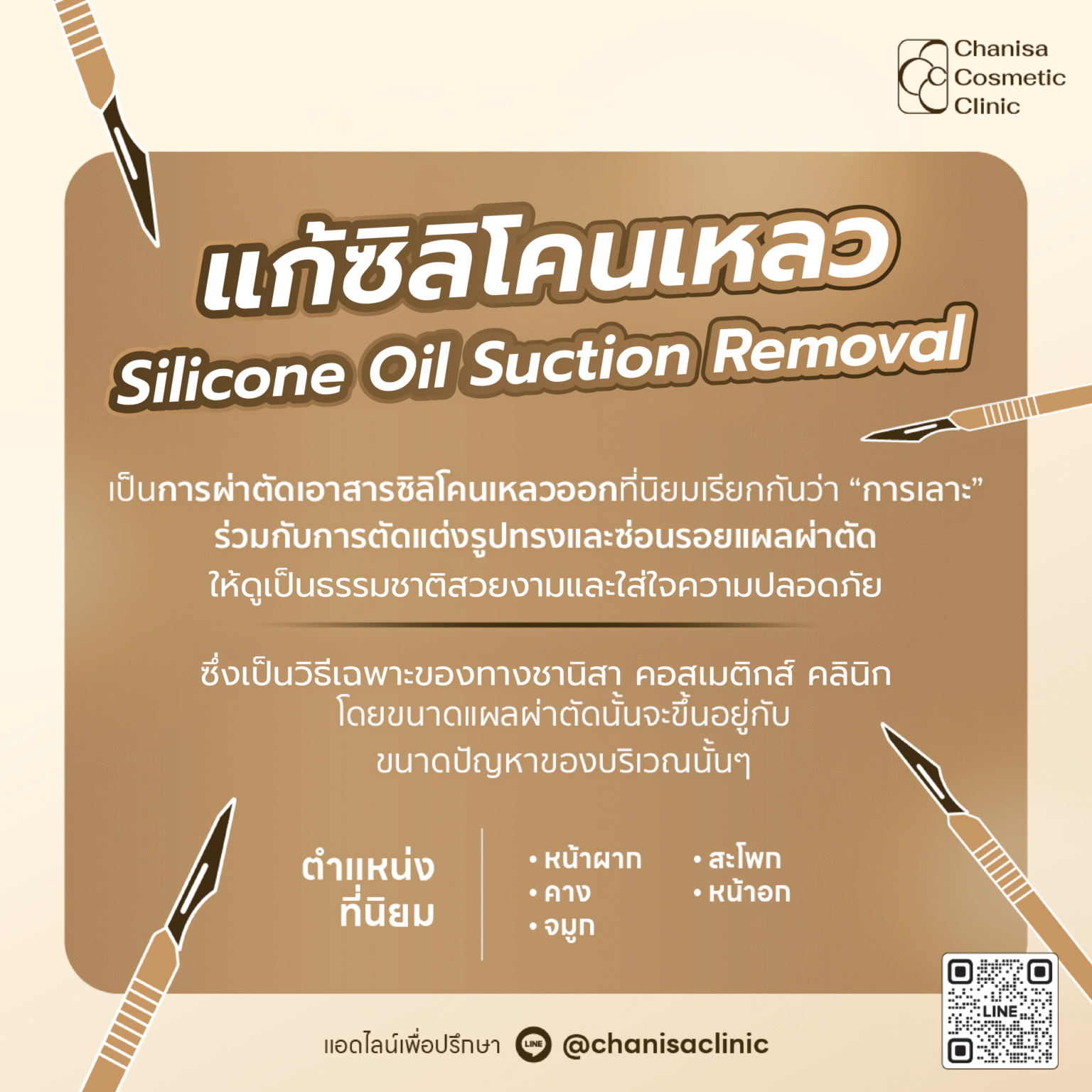 • Silicone Oil Suction Removal (SOSR) ของคลินิกสามารถนำสารเหลวออกได้อย่างมีประสิทธิภาพ แม่นยำ และใส่ใจในความปลอดภัย อีกทั้งยังเน้นการซ่อนแผล เพื่อให้รอยแผลเนียนและกลมกลืนกับสรีระ โดยการเย็บแผลที่ประณีตช่วยให้แผลเรียบเนียนและดูเป็นธรรมชาติ เป็นอีกวิธีหนึ่งซึ่งสามารถเอาสารแปลกปลอมออกจากร่างกายได้ คนไข้ทั่วไปยังเข้าใจผิด ใช้คำว่าขูด โดยปกติสารเหล่านี้เมื่อแข็งตัวแล้วไม่สามารถขูดได้ ซึ่งต้องทำโดยการผ่าตัดเลาะสารแปลกปลอมออก ตำแหน่งที่นิยมผ่าตัดเลาะออกทำได้ตั้งแต่หน้าผาก เปลือกตาบน เปลือกตาล่าง จมูก ริมฝีปาก และคาง หรือพื้นที่อื่นๆ ซึ่งแพทย์ต้องตรวจดูก่อน ซึ่งขนาดของแผลผ่าตัดขึ้นอยู่กับขนาดของปัญหาในบริเวณนั้นๆ