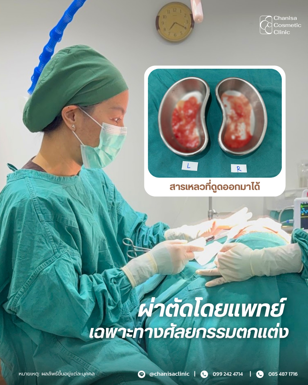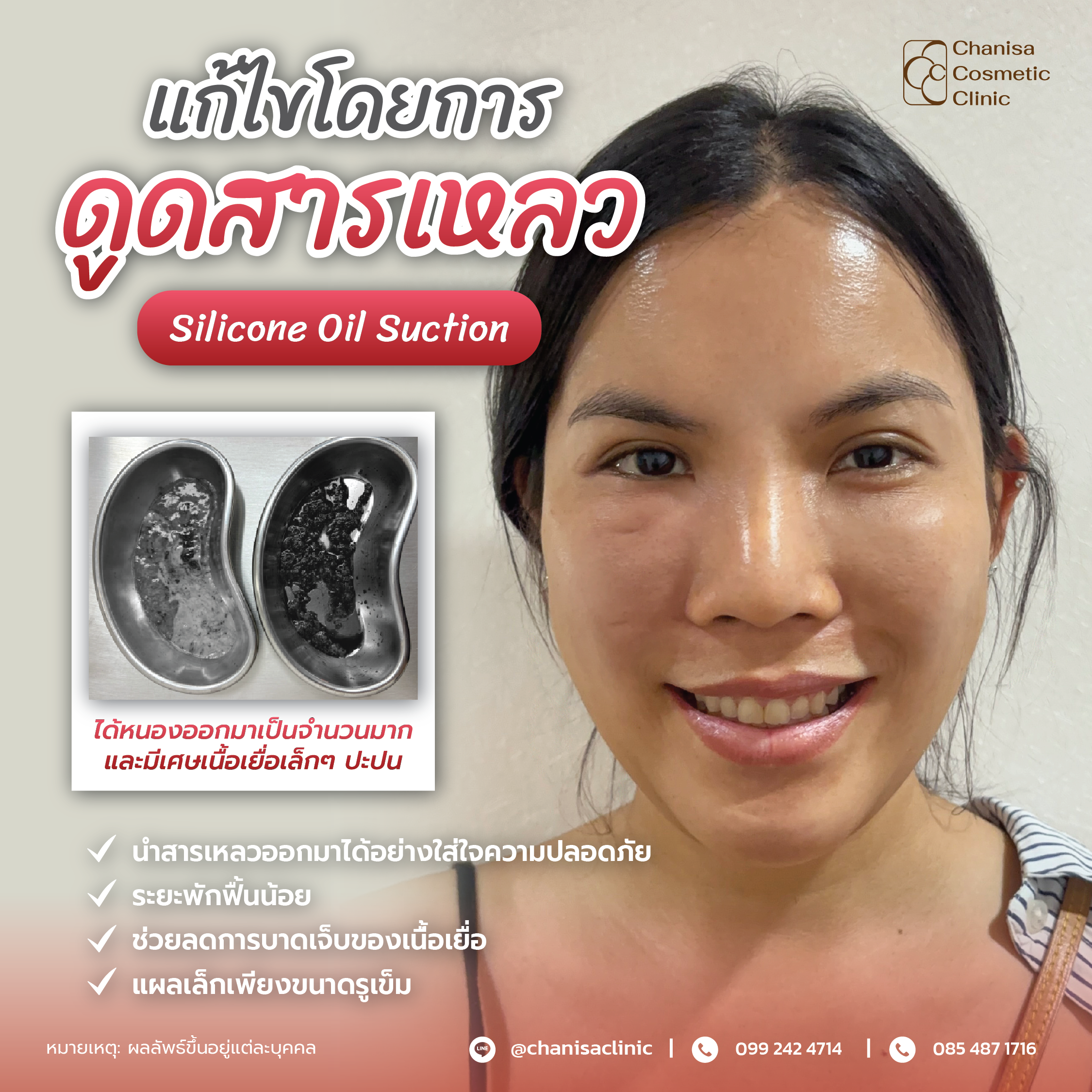 1. การผ่าตัดโดยการดูดซิลิโคนเหลว Silicone oil Suction (SOS) เป็นวิธีที่สามารถนำสารเหลวออกมา เหมาะสำหรับรายที่ก้อนสารแปลกปลอมยังไม่จับตัวแข็งมาก ซึ่งเป็นวิธีของทางคลินิกที่ช่วยลดการบาดเจ็บของเนื้อเยื่อด้วยการทำแผลเล็กเพียงขนาดรูเข็ม ส่งผลให้ฟื้นตัวได้รวดเร็วและลดความเสี่ยงในการเกิดแผลเป็นได้อย่างมีประสิทธิภาพ