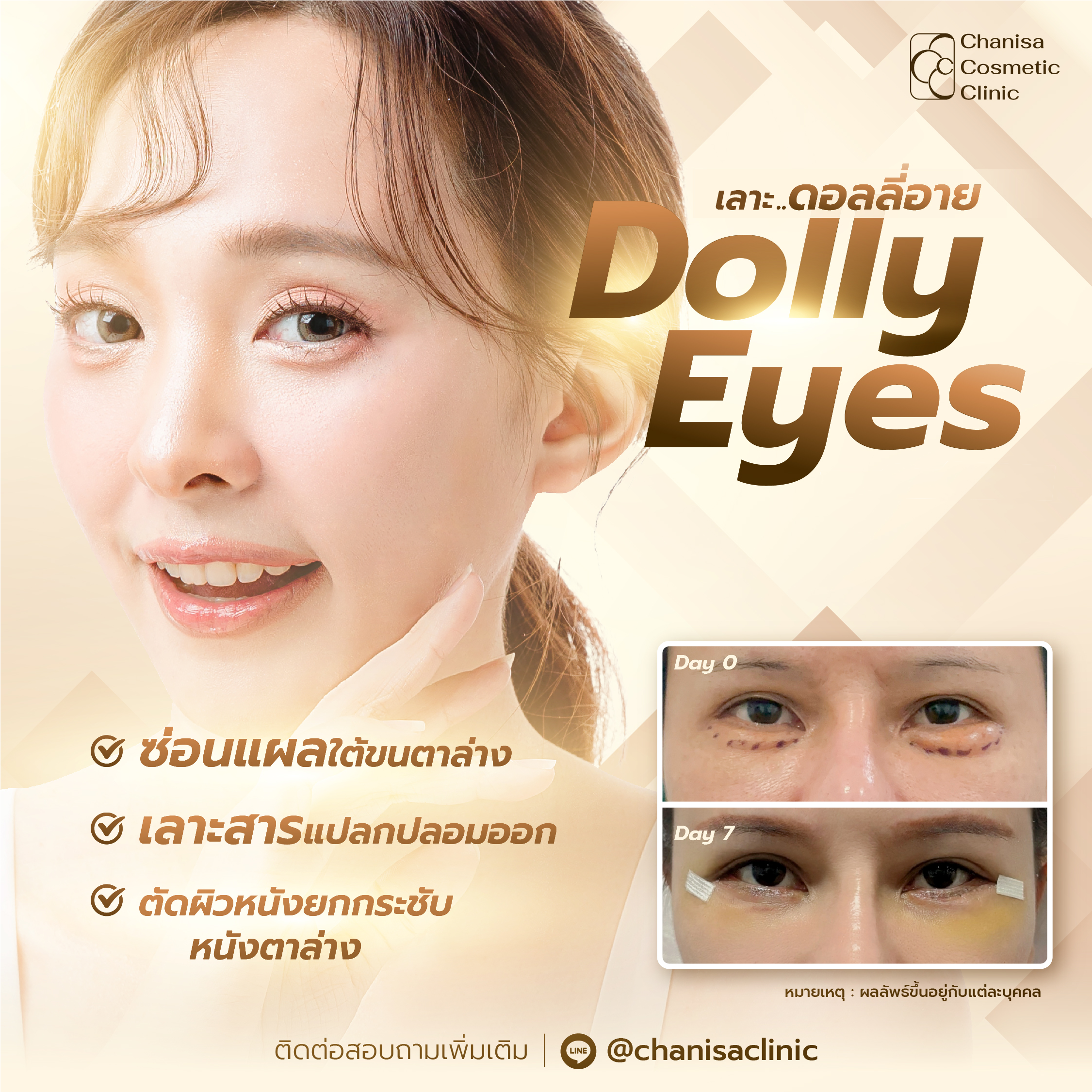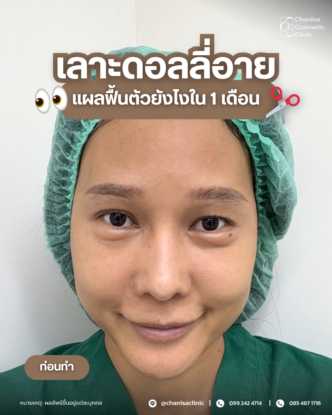 - การซ่อนแผล: แผลถูกซ่อนอย่างประณีตบริเวณขนตาล่าง เพื่อให้ผลลัพธ์ดูเรียบเนียนและดูเป็นธรรมชาติ ลดความอ่อนล้าใต้ตา และเพิ่มความมั่นใจให้กับคนไข้