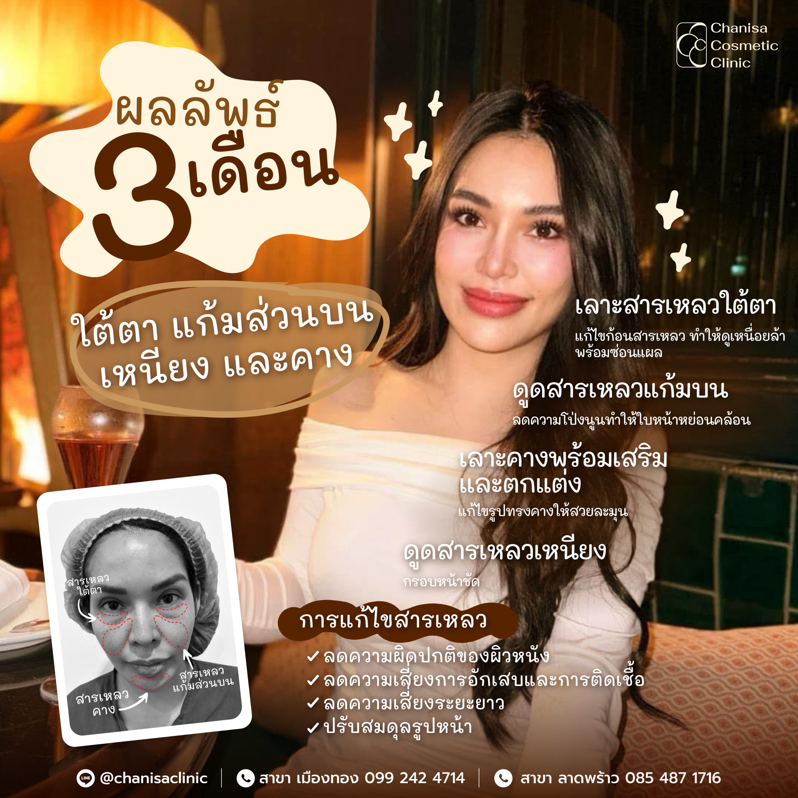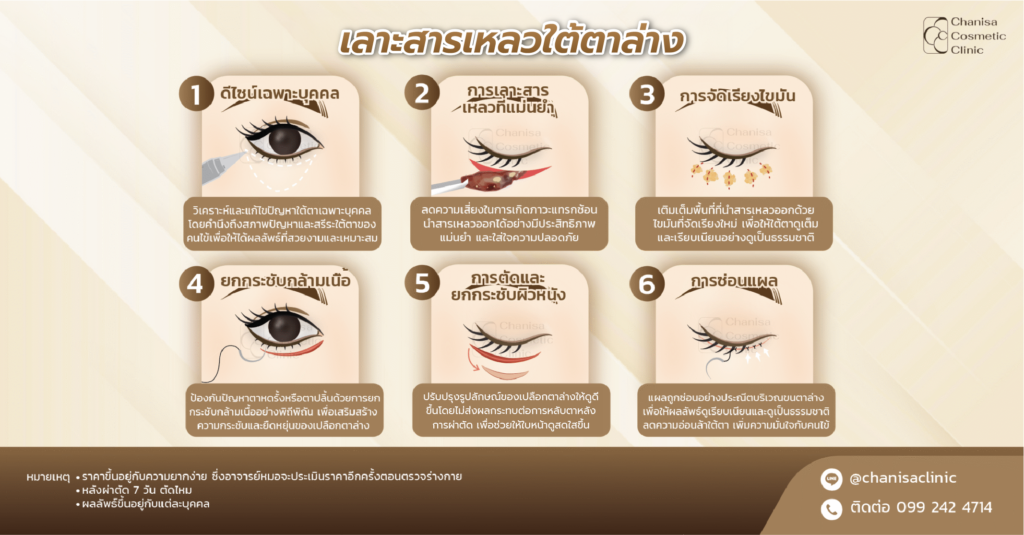 - การจัดเรียงไขมัน: เติมเต็มพื้นที่ที่นำสารเหลวออกด้วยไขมันที่จัดเรียงใหม่ เพื่อให้ใต้ตาดูเต็มและเรียบเนียนอย่างดูเป็นธรรมชาติ