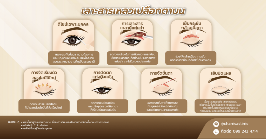 - การตัดตกแต่งผิวหนัง: ลดความหย่อนคล้อยและปรับรูปทรงเปลือกตาให้เรียบเนียนกระชับ