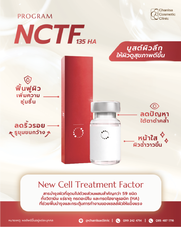NCTF โปรแกรม NCTF เหมาะกับใคร ผู้ที่มีผิวแห้ง ขาดน้ำ หมองคล้ำผู้ที่มีริ้วรอยเล็กๆ ผิวหย่อนคล้อยผู้ที่ต้องการผิวฉ่ำวาว สุขภาพดี ดูเปล่งประกายผู้ที่ต้องการฟื้นฟูผิวให้แข็งแรงจากภายใน ระยะเวลาของผลลัพธ์ ทำ 1 ครั้ง ผลลัพธ์อยู่ได้ 1 เดือนเว้นระยะทำ 3 สัปดาห์ ทำครบ 3 ครั้ง ผลลัพธ์อยู่ได้นาน 3-6 เดือนเว้นระยะทำ 3-6 เดือน ครั้งที่ 4-5 ผลลัพธ์อยู่ได้นาน 6 เดือน